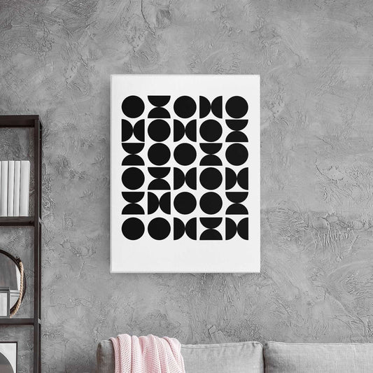 The artwork style is all about clean lines, shapes and a modern structure with balance. Geometric shapes are used within bauhaus designs, including squares, circles and triangles. The shapes within the art represent abstract graphics or meanings, and are combined together to create an overall piece of art that makes a statement.