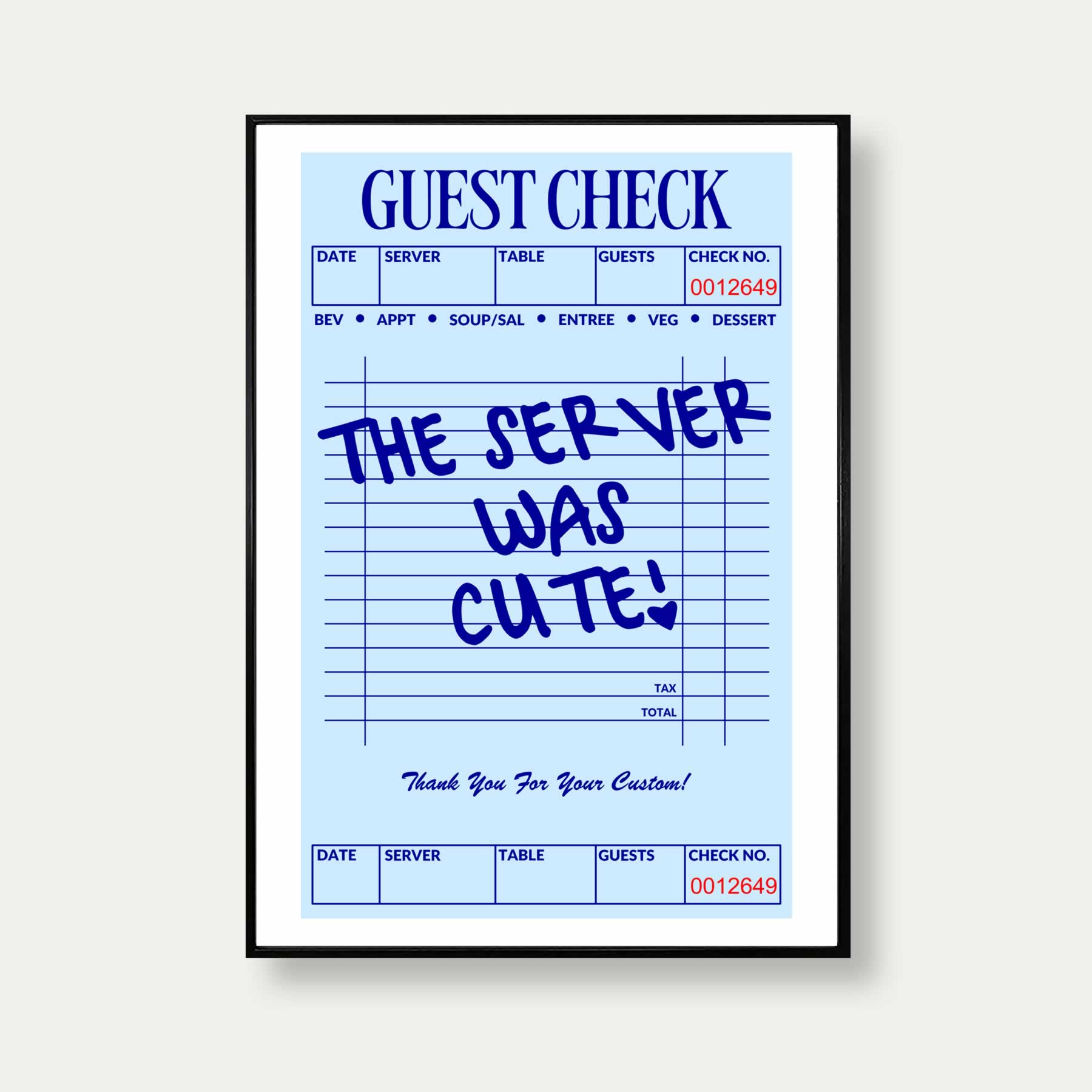 Add some fun to your home with our Guest Check print. This piece of wall art has our very own graphic design of a guest check, along with some marker pen writing in a contrasting colour The Server Was Cute.