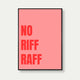 Our No Riff Raff poster is a typography print which comes in a range of colours to suit your home decor. As styled in home photos in grey, a timeless colour that works well on almost any wall.