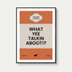 It's a print that every Geordie needs on their wall, What Yee Talkin Aboot. Whenever someone tells a lie or exaggerates in Newcastle, you'll hear the phrase what yee talkin aboot.